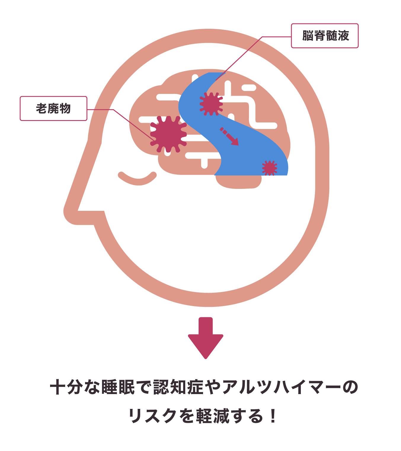 脳の重さは成人で約1200〜1400g程度で、体全体の18%ものエネルギーを消費しています。その分多くのエネルギーを要するため、毎日多くの老廃物を出しています。からだの場合、老廃物はリンパによって流されます。しかし脳にはリンパがないため、脳内をめぐる脳髄液という液体で洗い流されるようにして排出されるのです。老廃物の除去は、主に睡眠中に行われるため、睡眠不足が続くと老廃物が蓄積された状態に。老人斑の出現やアルツハイマーを引き起こす原因に繋がります。老廃物は数十年単位で蓄積されるといわれているため、「まだ若いから」といって、睡眠を削るような生活は避けましょう。
